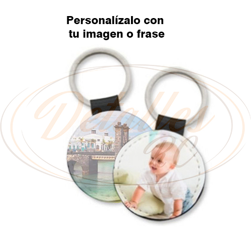 Llavero de piel sintética circular, personalizado una cara. Trasera de color negro.