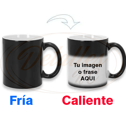 Taza negra que al poner líquido caliente deja ver la imagen o texto.