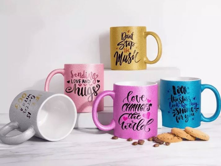 Taza con el exterior de purpurina de color.